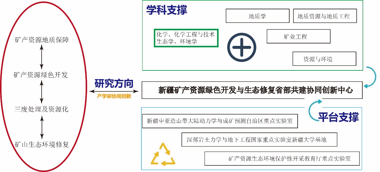 新疆矿产资源绿色开发与生态修复区部共建协同创新中心形成了涵盖“矿产资源地质保障-矿产资源绿色开发-三废处理及资源化-矿山生态环境修复”为一体的特色研究方向。